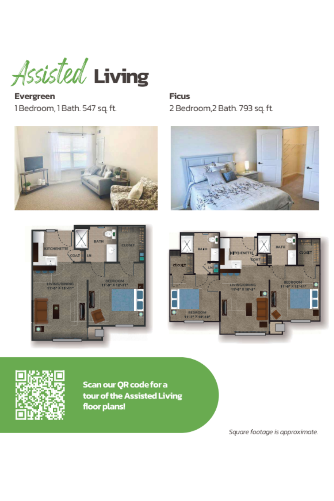 Discover comfort and peace of mind in our Evergreen one-bedroom, one-bathroom assisted living apartment — 547 sq. ft. of thoughtfully designed living space for $5,640/month.